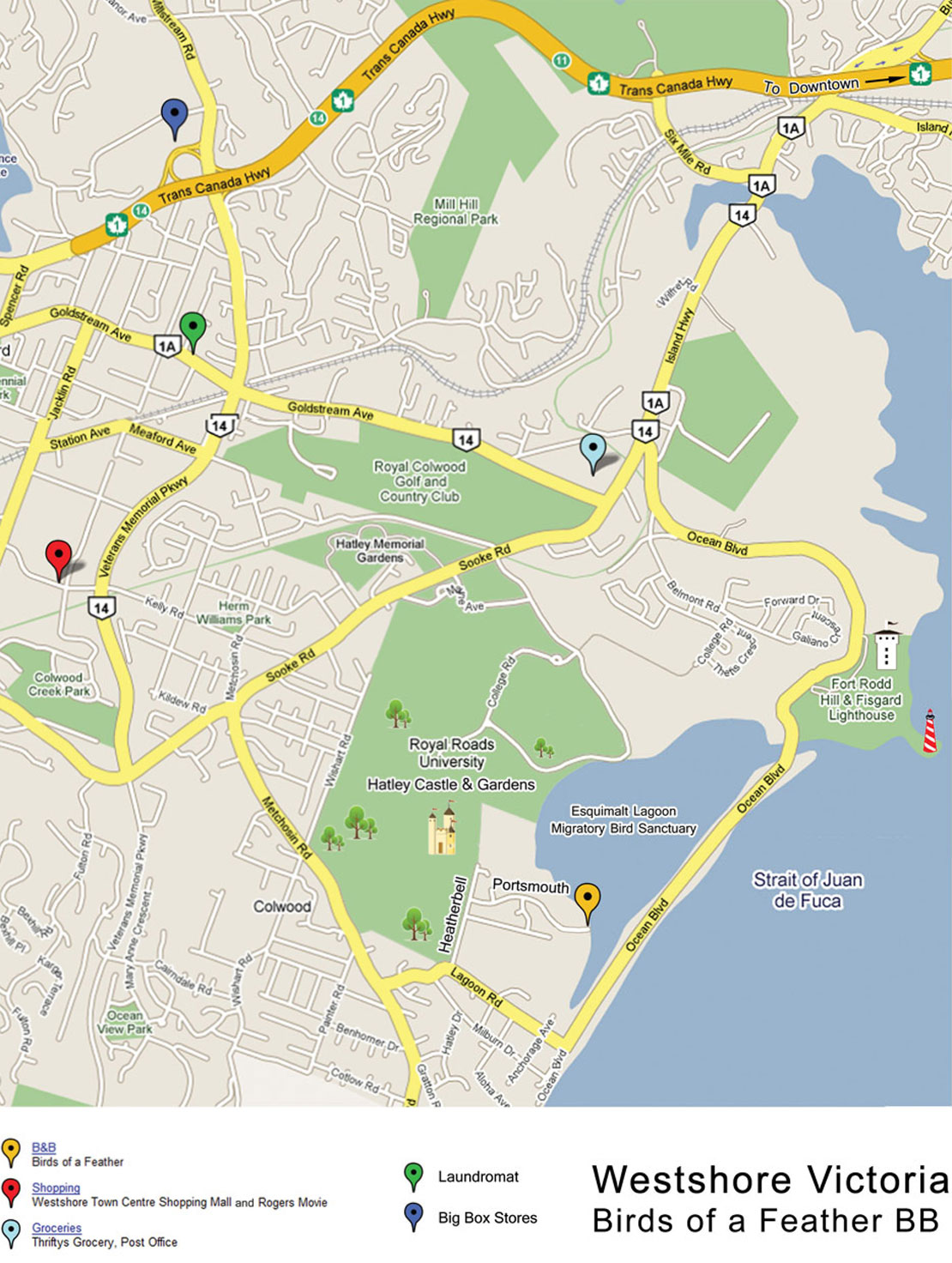 - follow Hwy 1 take the Colwood / View Royal exit #10 if going northbound (exit 11 if driving southbound), then turn right onto Hwy 14 at the Six Mile Pub (aka Sooke Rd or Old Island Hwy),